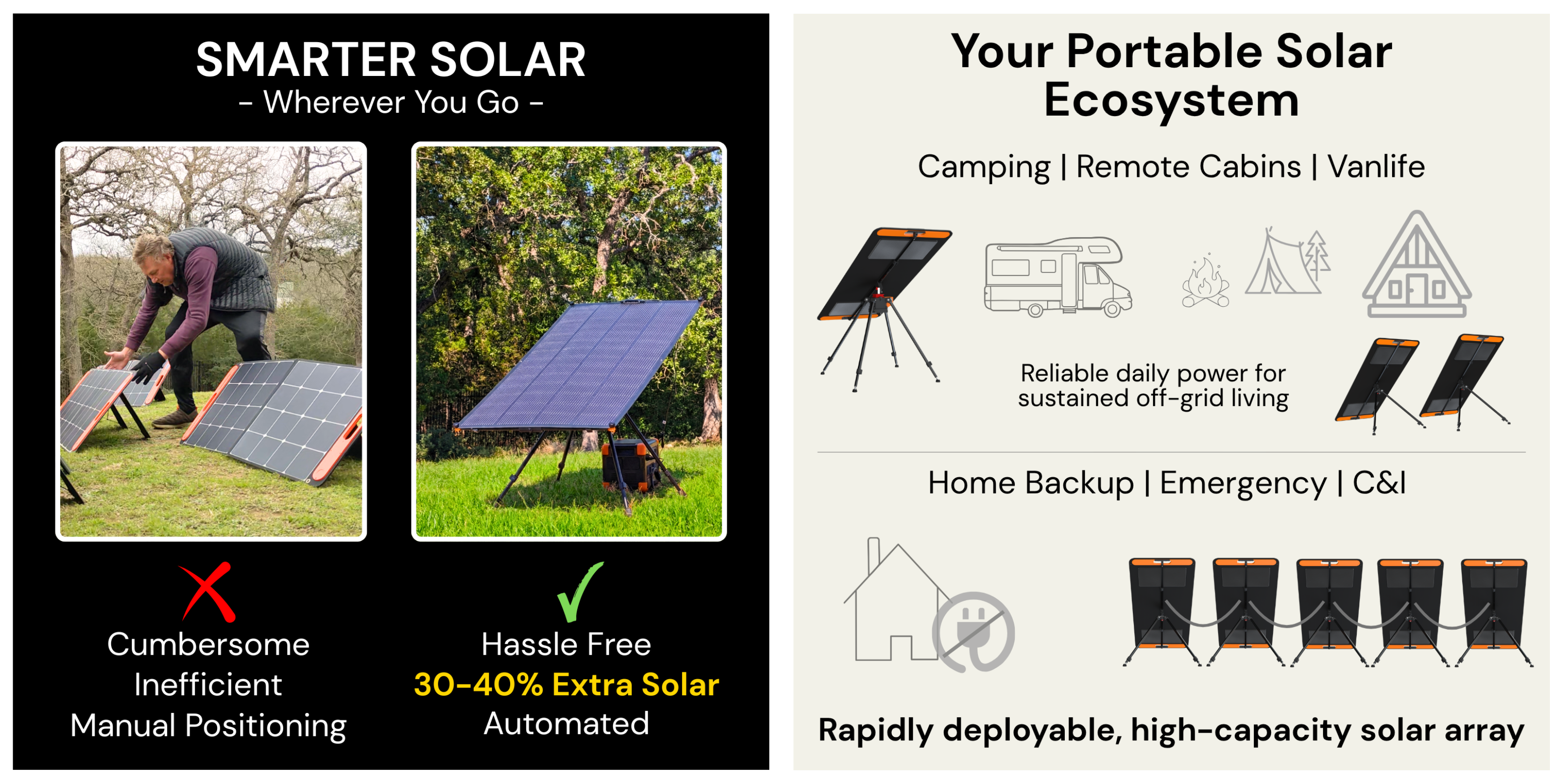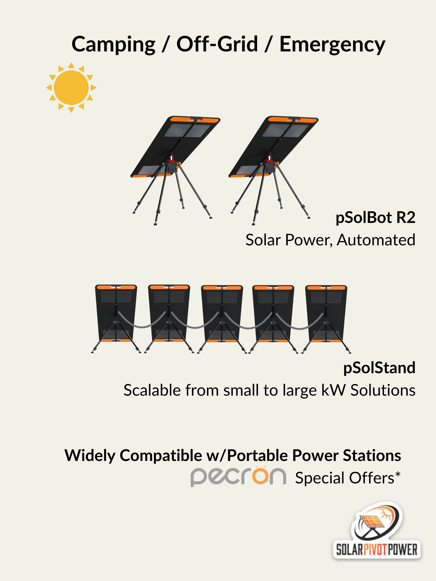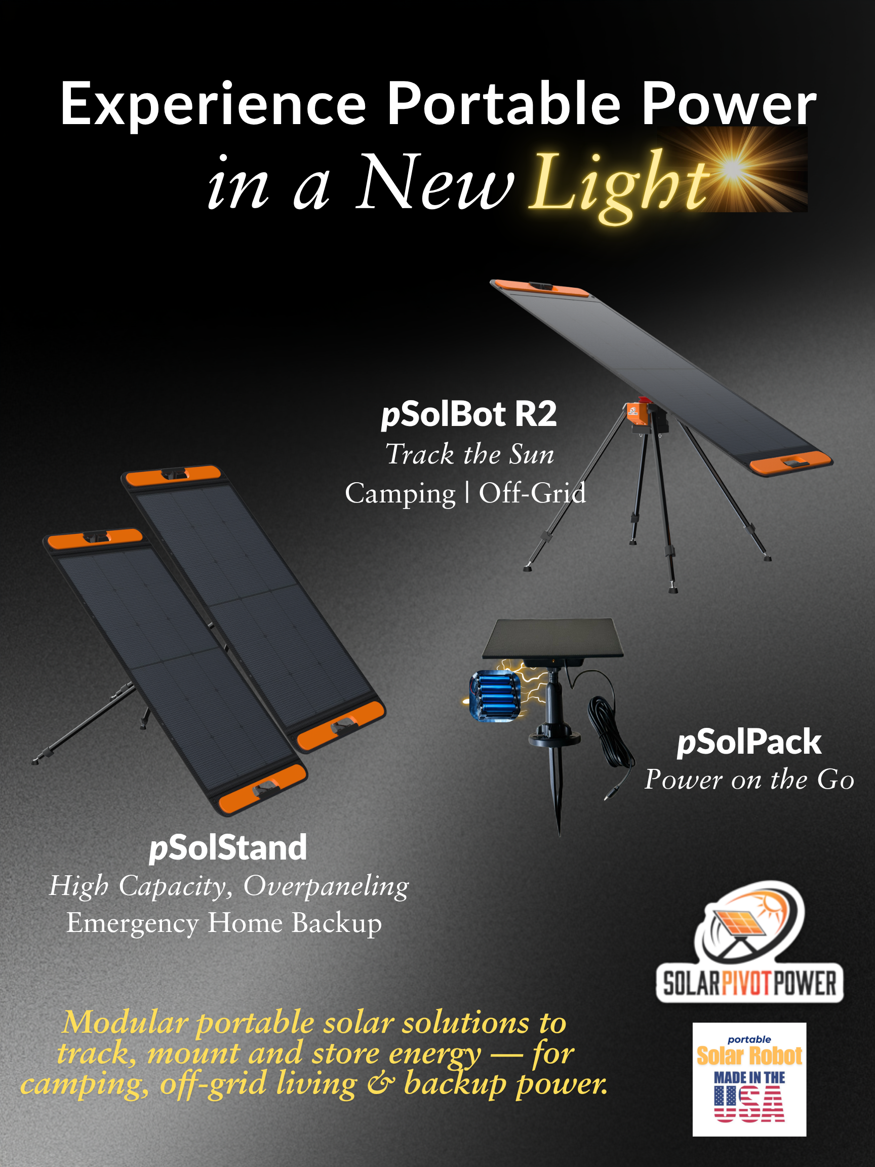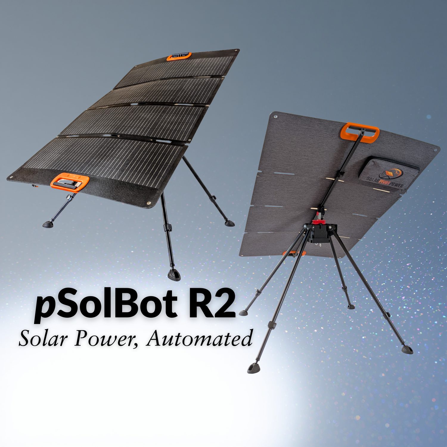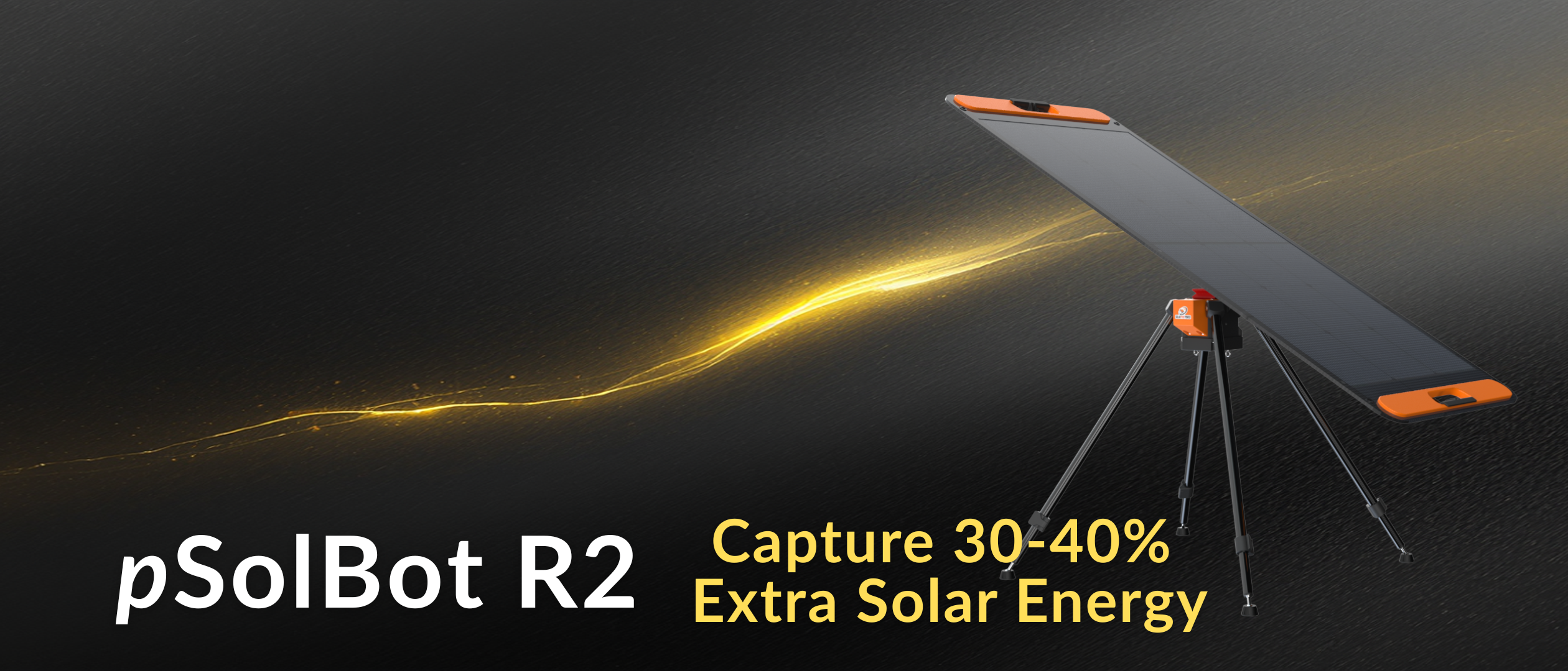 pSolBot R2: Our next-generation solar tracker automatically follows the sun to maximize efficiency. Supporting up to 250W panels, it ensures your camping and off-grid setups stay charged effortlessly.