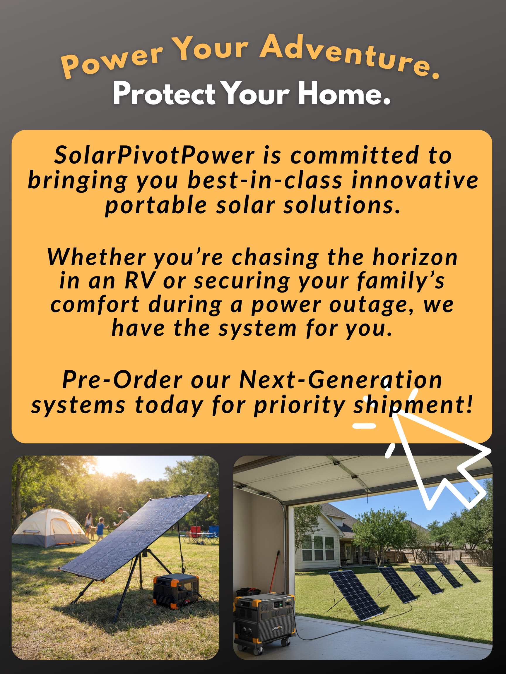 We are proud to bring innovative, portable solar solutions to the world, designed and built right here in Austin, TX, USA. When you choose SolarPivotPower, you’re choosing American ingenuity and rugged reliability.